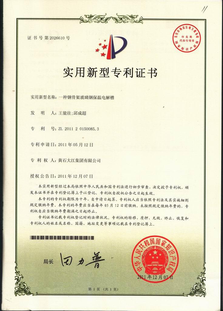 一、 實用新型電解槽(本公司專利產品ZL201120150085.3)